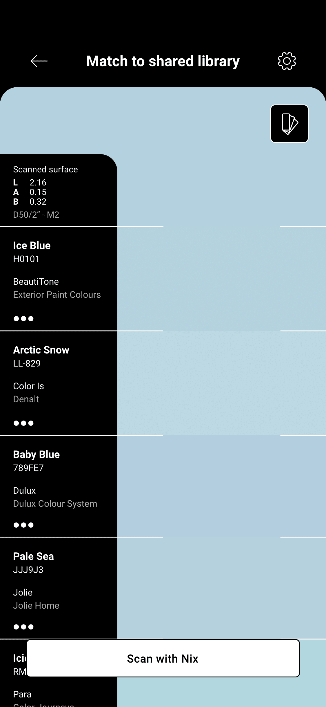 Scan your sample and the app will display the closest color match from your shared color library.