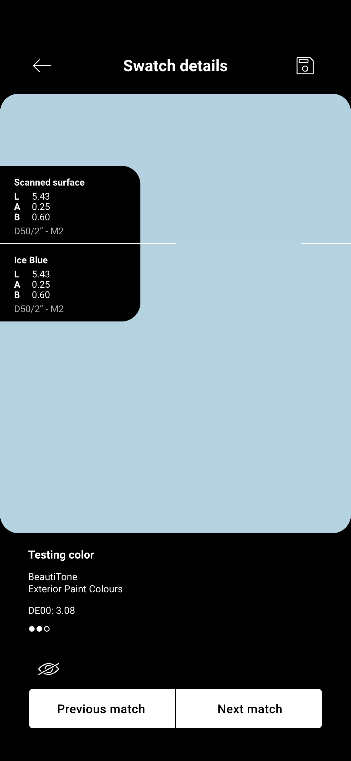 05 Tap on the swatch for a larger comparison and for color details. Save and organize your swatch into folders, or share with clients and friends.