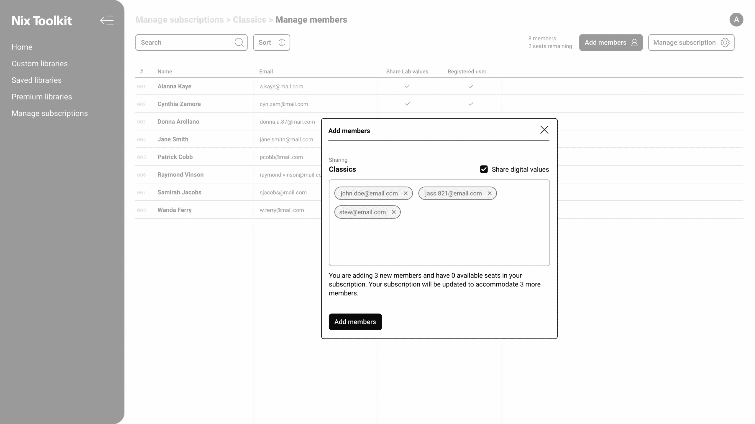 Set up subscriptions for your custom libraries and share them with other users on the companion Nix Toolkit dashboard. Control the color standards they can access, and send live updates out to your users. Use the same login from the app to sign in to the dashboard to manage your users. Access the Nix Toolkit dashboard.